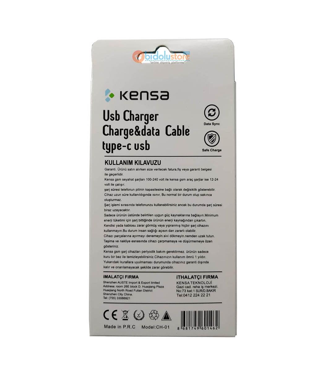 İçindekiler: Kensa 2.1 Amper Şarj Adaptörü, 1.2 Metre Type-C Şarj ve Data Kablosu